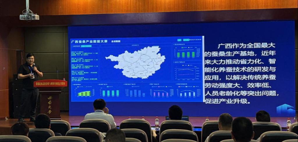 在资源昆虫健康养殖与产业发展研讨会上,我校参会代表围绕蚕桑高效绿色种养与生态保护、机械化智能化生产、资源多元高值化利用等方面,与国内外同行进行了深入探讨。此外,我校安慧高级实验师在研讨会上分享了《广西省力化智能化养蚕技术研发及应用推广》主题报告,围绕广西高温高湿气候以及喀斯特地区特点,探讨省力化、智能化、数字化养蚕技术研发与应用,推动传统蚕桑业向现代化、数字化、高效化转型。
