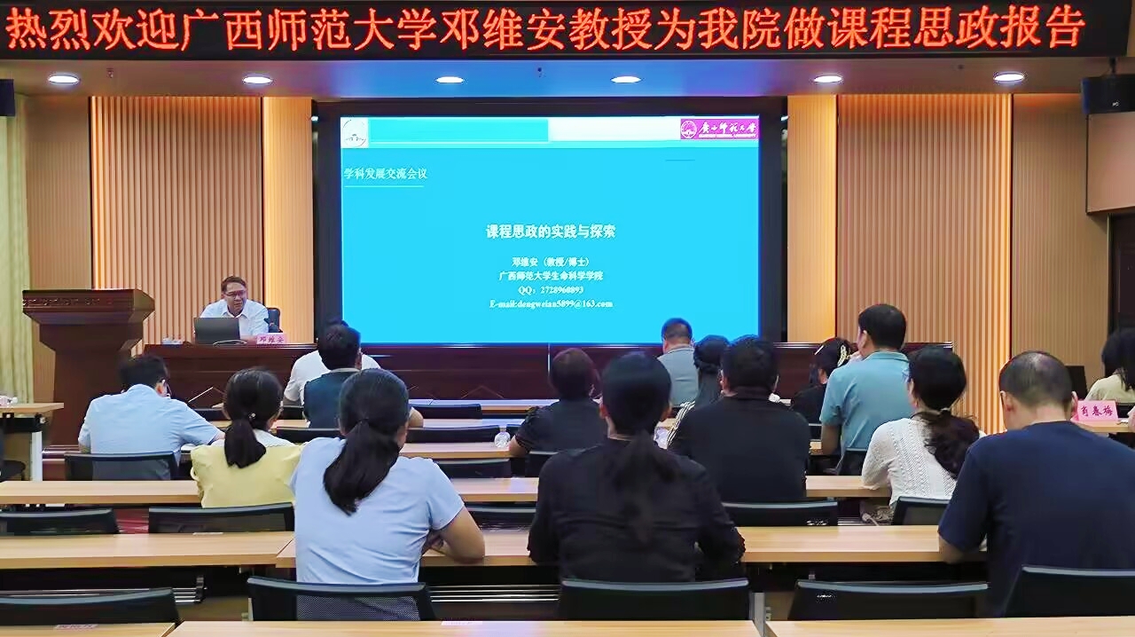9月21日,广西师范大学邓维安教授莅临我校,在格致楼101室作《课程思政的实践与探索》专题报告。金沙9001cc 以诚为本师生参加报告会,本次报告会由教务处副处长肖春梅主持。