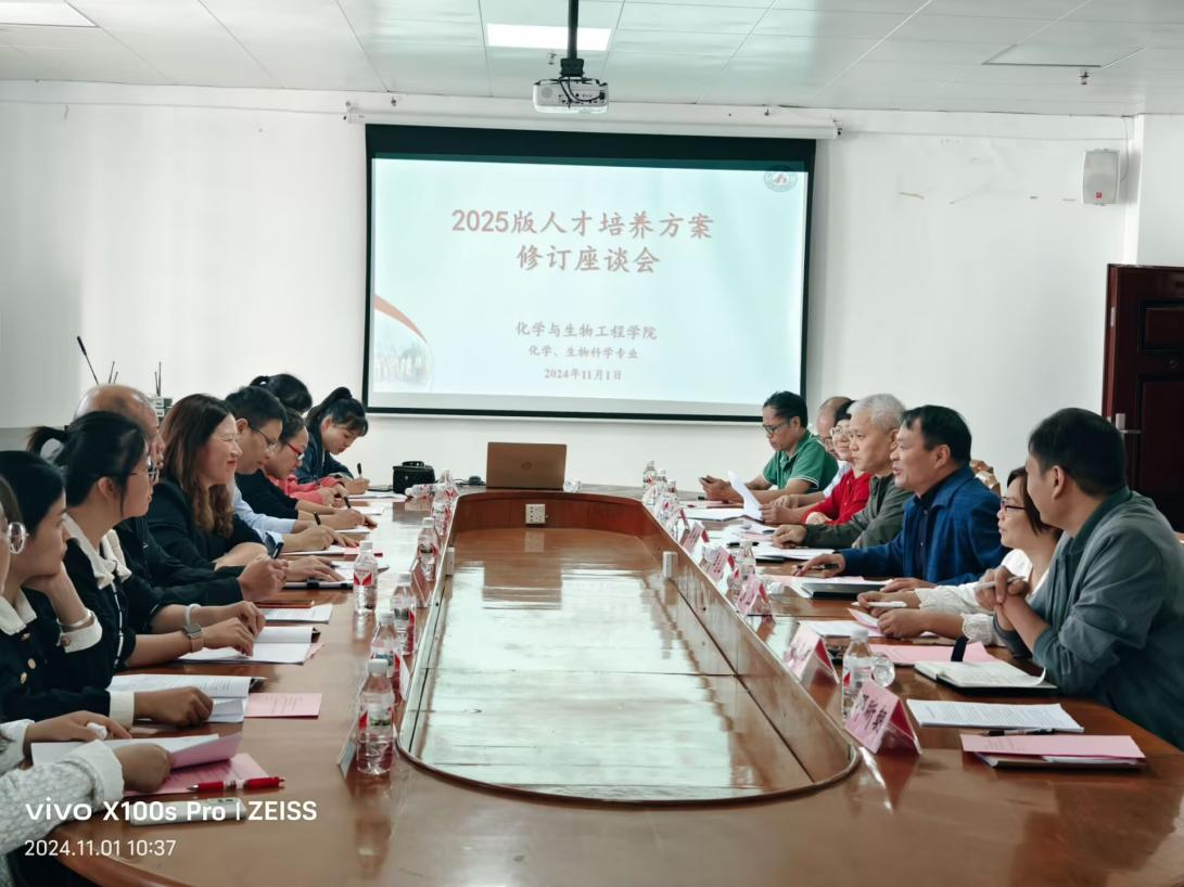 11月1日,金沙9001cc 以诚为本在格致楼823会议室召开生物科学、化学专业2025版专业人才培养方案修订座谈会。此次座谈会邀请河池市教育科学研究所生物学教研员莫乃璐、化学教研员卢安校,宜州一中、宜州高中、宜州实验高中、金沙9001cc 以诚为本附属中学的生物学、化学教师代表及毕业生代表参加座谈会,金沙官网党委书记覃宝山出席座谈会,生物科学专业责任教师苏江,化学专业责任教授覃世辉,及教师代表参加座谈会。