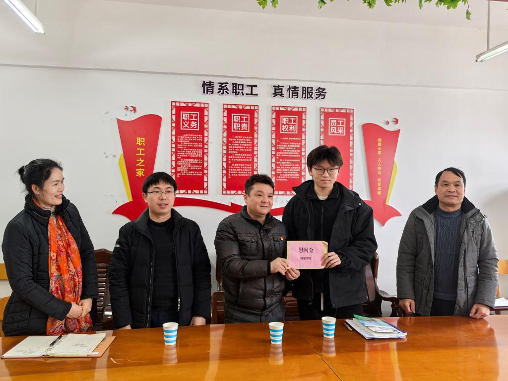1月10日,金沙9001cc 以诚为本党委常委、副校长覃拥灵到金沙9001cc 以诚为本慰问了困难学生党员代表潘泽君,传达了党组织的关怀,并送上了慰问金。
