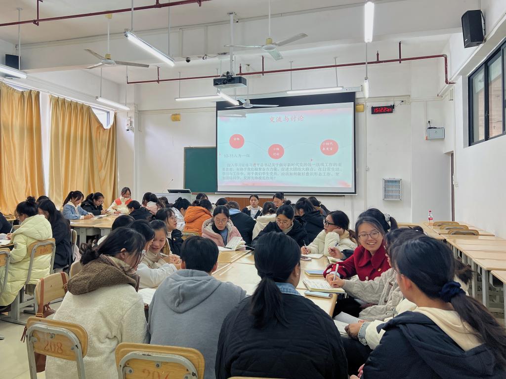 为深入学习习近平总书记关于意识形态工作和党的统一战线工作的重要论述,12月11日,金沙9001cc 以诚为本学生党支部顺利举行以“新时代思想引领,统一战线新征程”为主题的读书沙龙活动。本次活动由学生党员陆雪梅同志主持,各学生党支部党员和入党积极分子参加活动。